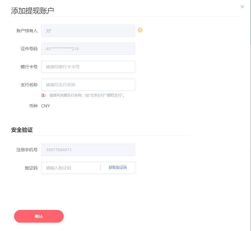 官网登录帐号后,点击右上角的“倒三角”按钮,再点击“提现账户”进行添加,仅限绑定于认证主体一致的银行卡,最多可添加10张银行卡。